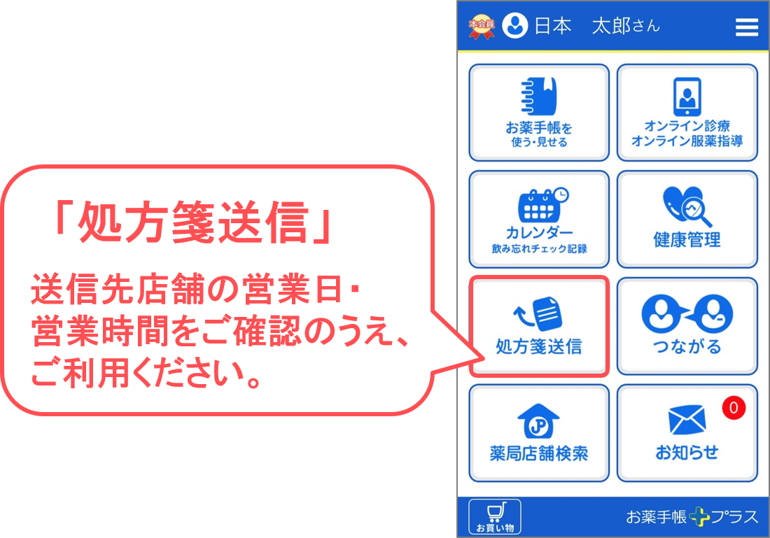 「処方箋送信」をご利用の場合は、送信先店舗の営業日・営業時間の事前確認をしていただけますよう、よろしくお願い申しあげます。